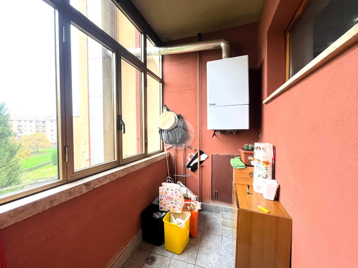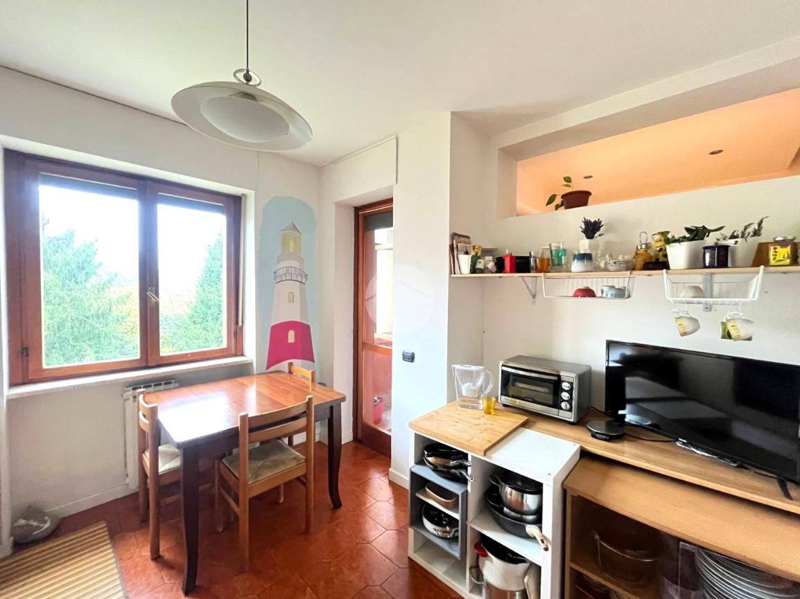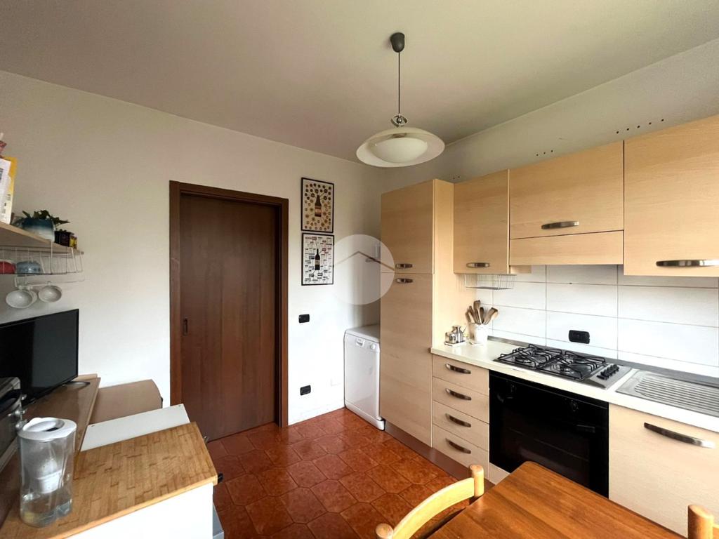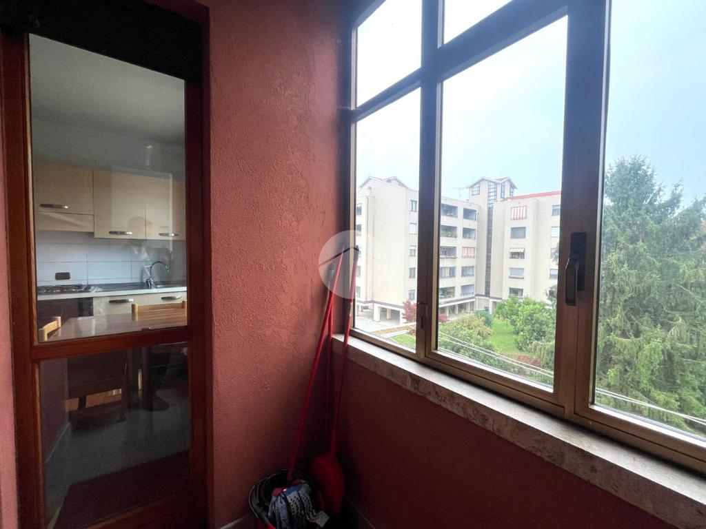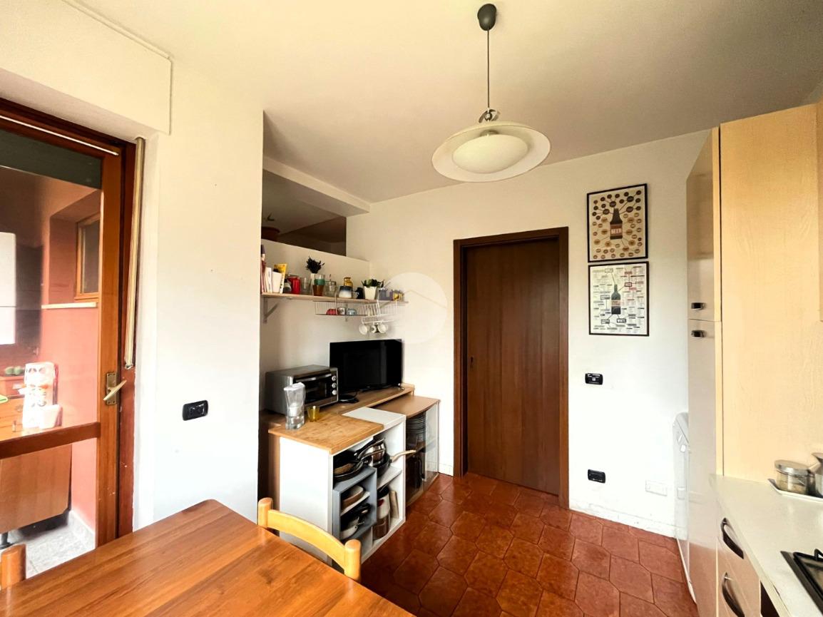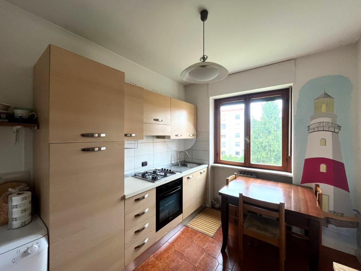 La cucina è abitabile con porta finestra a condurre al primo balcone affacciato sul giardino condominiale interno.