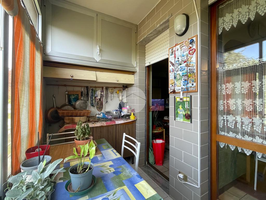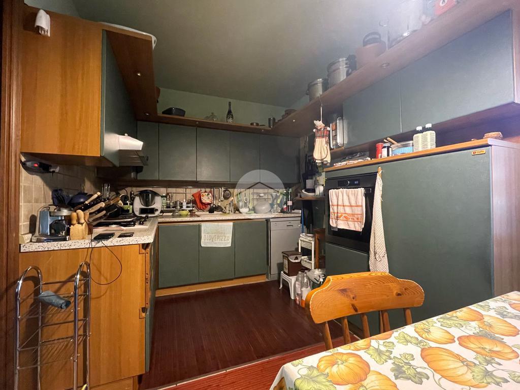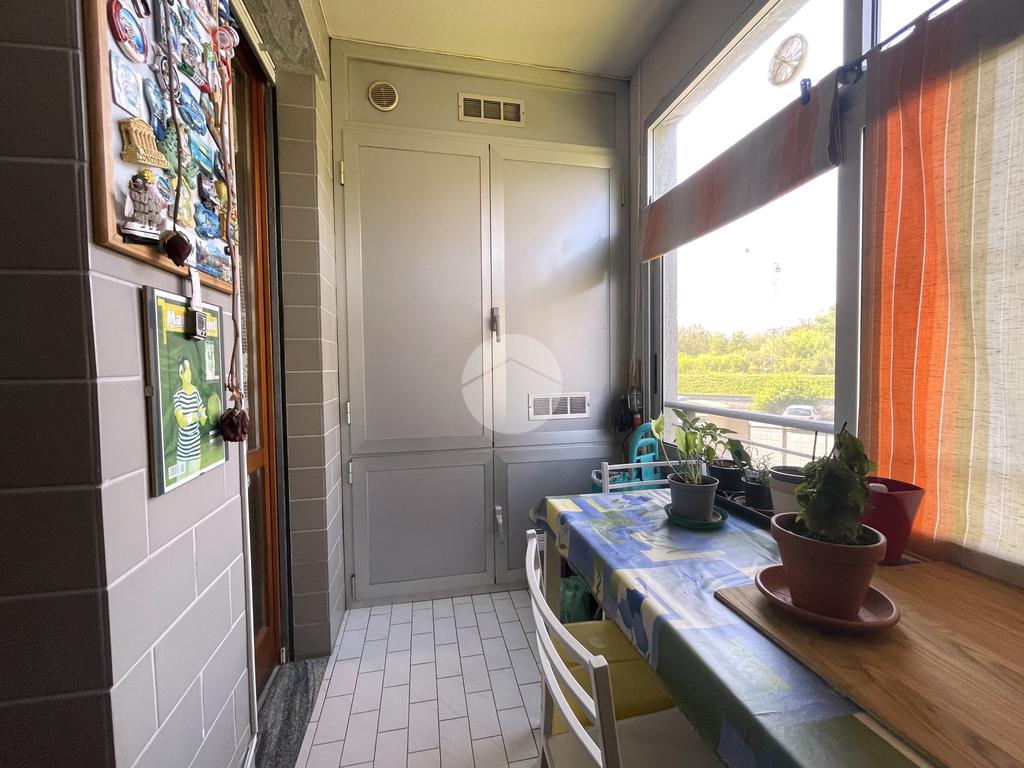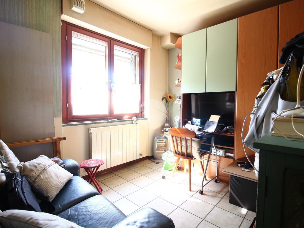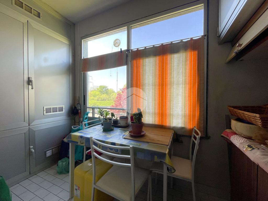 L’ingresso si apre su un accogliente soggiorno collegato alla cucina abitabile a vista, entrambi con accesso diretto a un balcone verandato, ideale come zona lavanderia o per ospitare il locale caldaia.