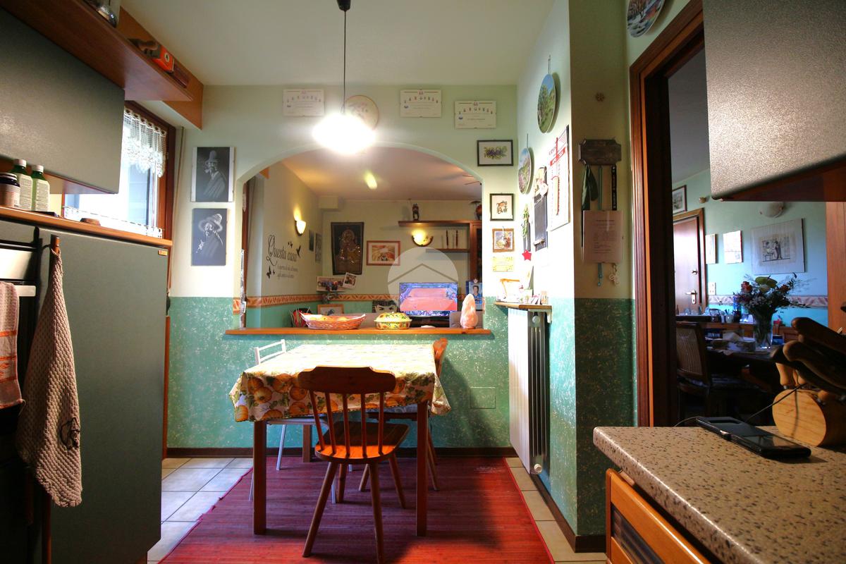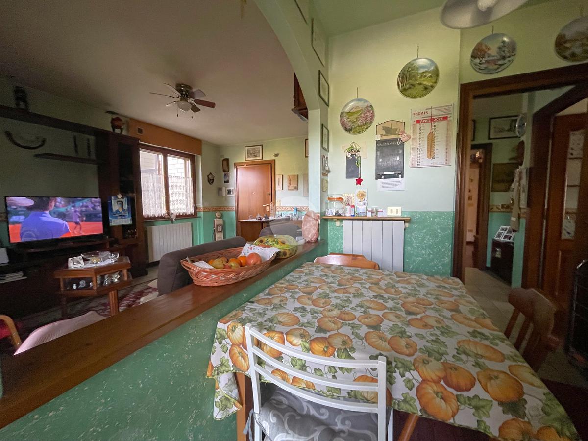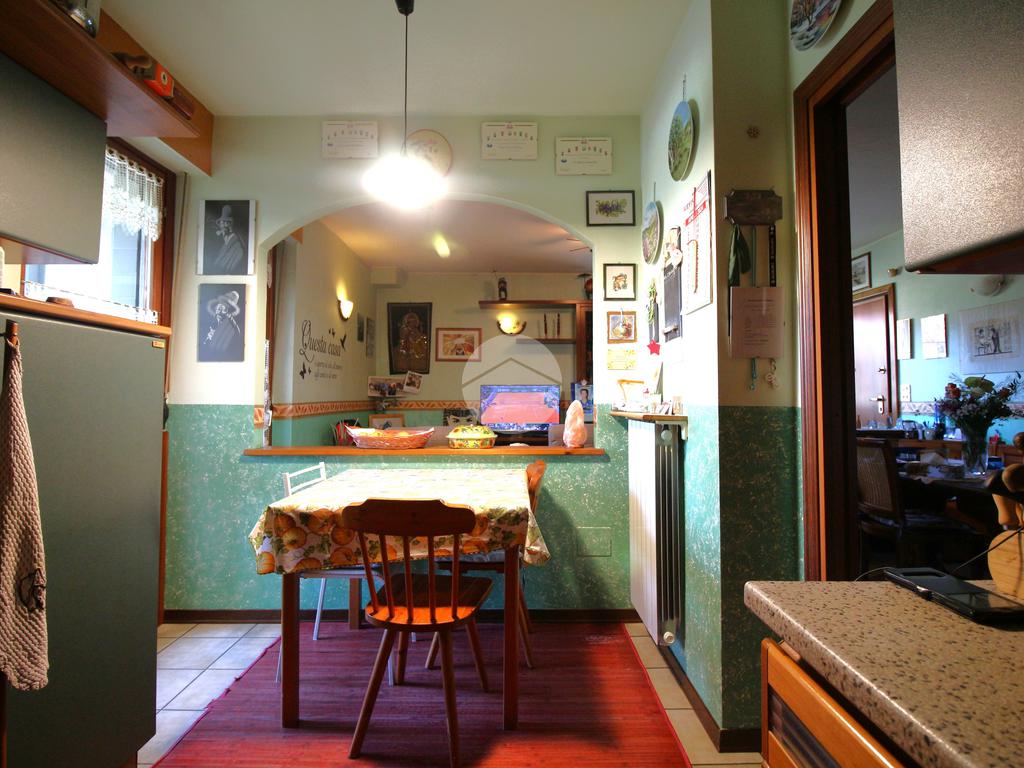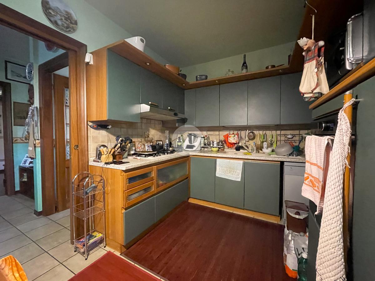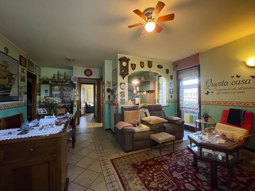 L’ingresso si apre su un accogliente soggiorno collegato alla cucina abitabile a vista, entrambi con accesso diretto a un balcone verandato, ideale come zona lavanderia o per ospitare il locale caldaia.