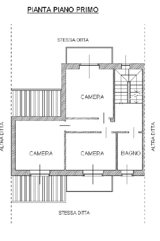 Al primo piano, il disimpegno conduce alla zona notte composta da una cameretta con balcone affacciato sul giardino anteriore, una camera matrimoniale e una seconda cameretta con balcone che si affaccia sul giardino posteriore oltre che un bagno finestrato con doccia.