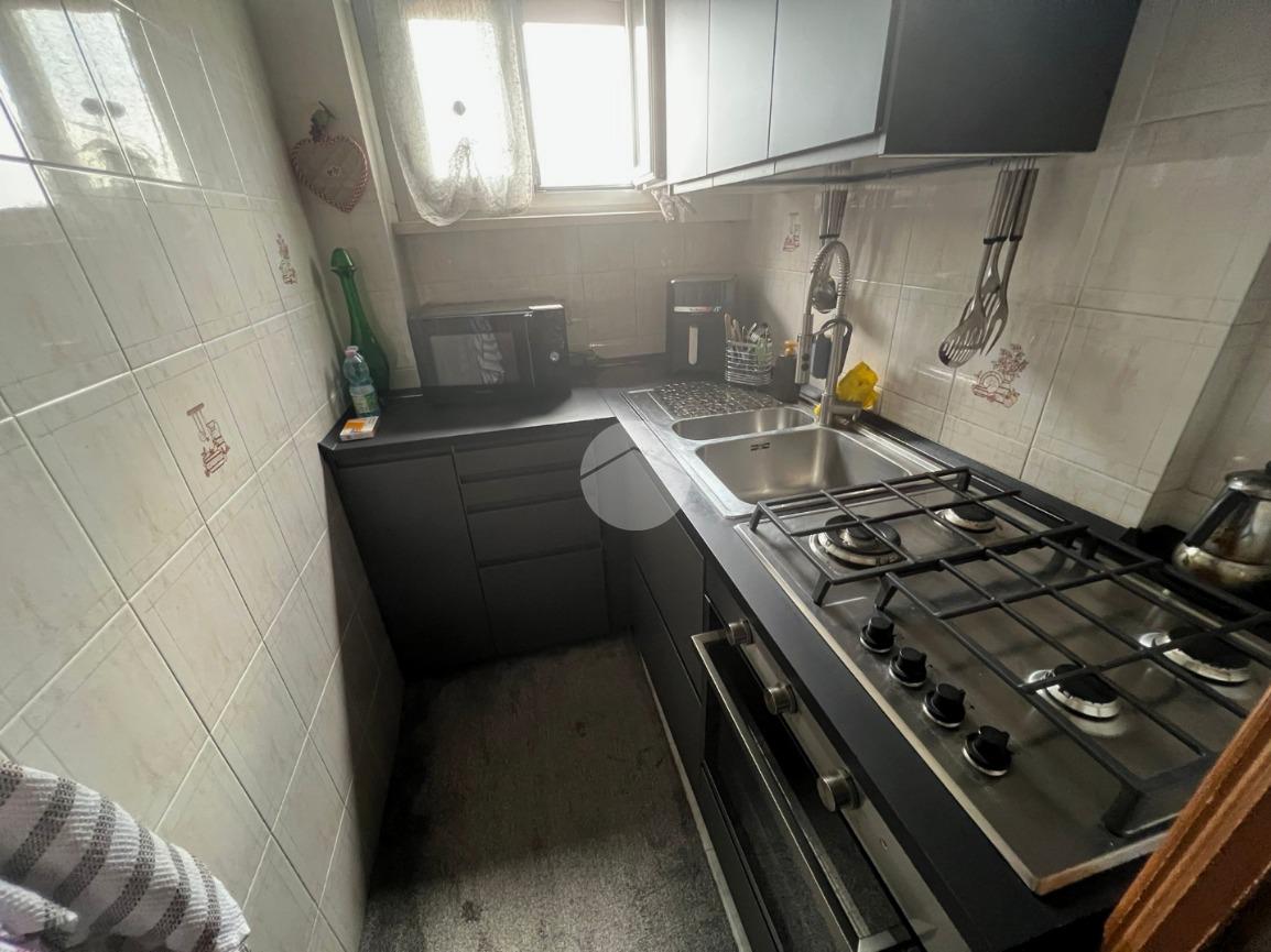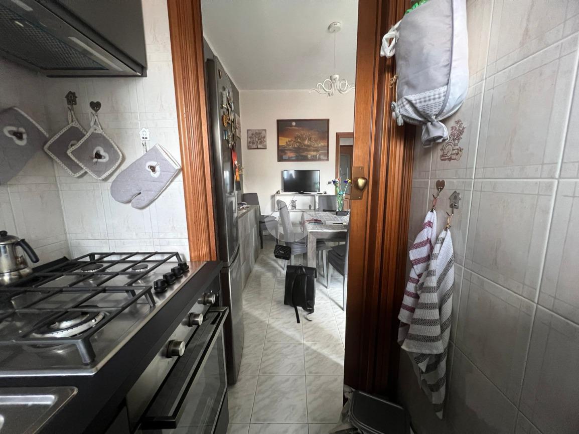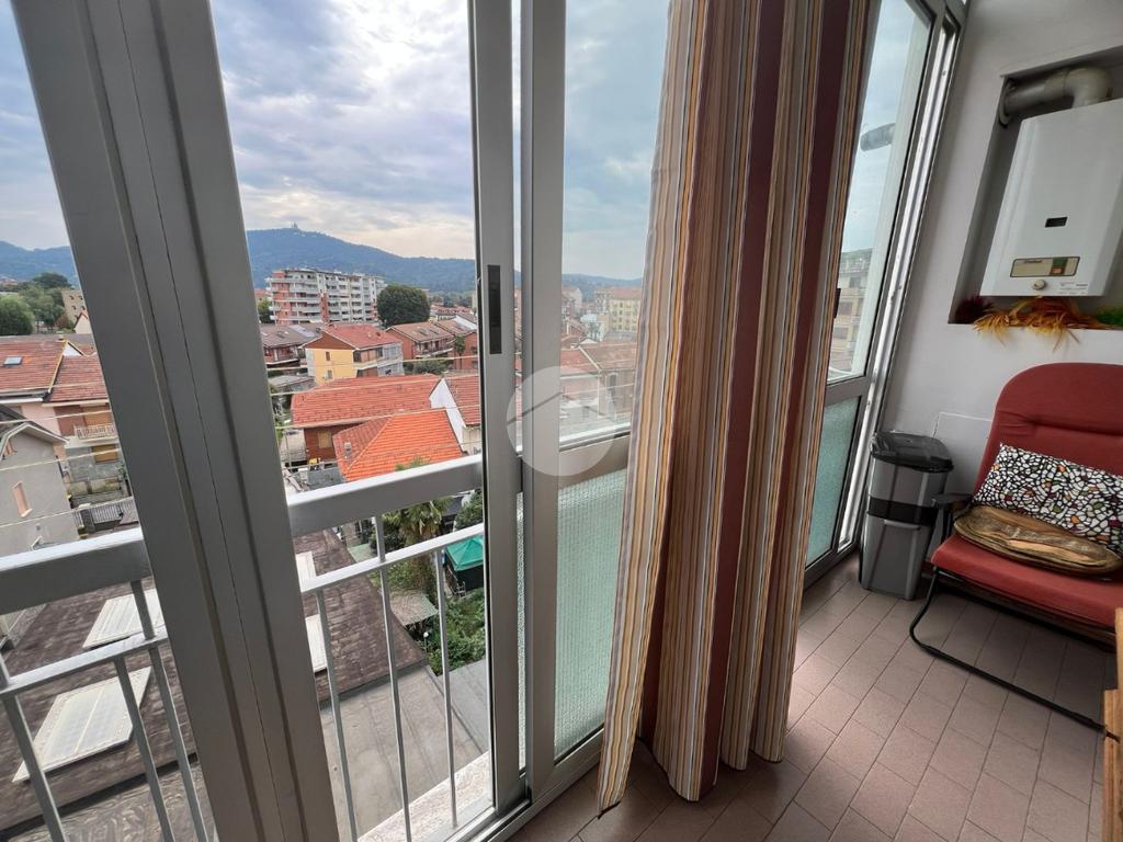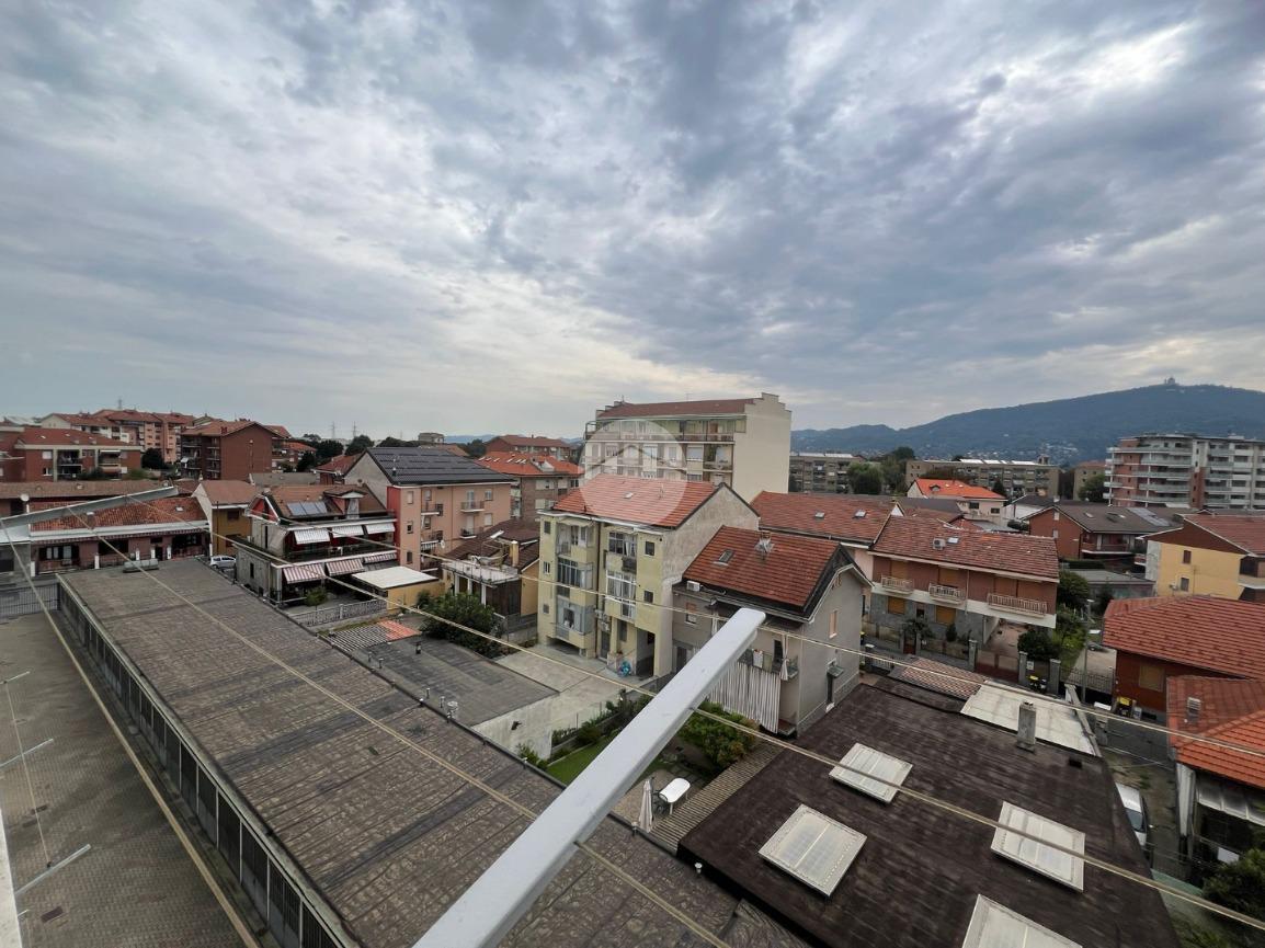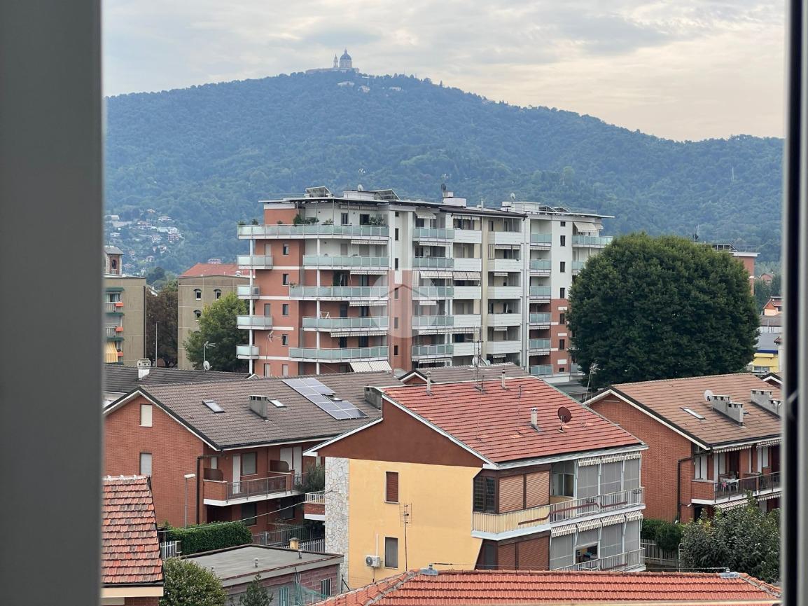 Il tinello squadrato risulta luminoso, grazie alla porta finestra che conduce al balcone verandato, e il cucinotto è finestrato con scorcio sulla Basilica di Superga.