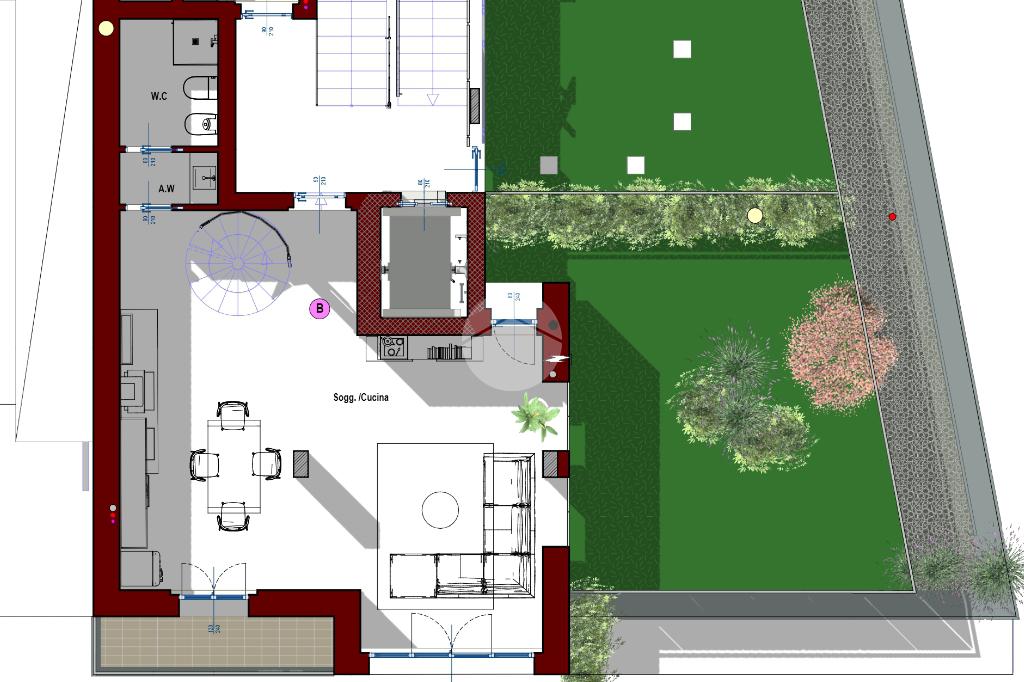 La soluzione si sviluppa con ingresso tramite portoncino blindato con cilindro antibulgaro europeo direttamente sulla zona giorno con cucina a vista.